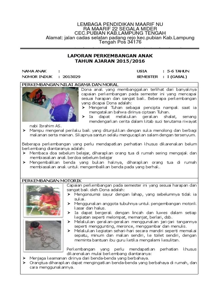Contoh Laporan Perkembangan Anak Tk Semester 2 : Contoh Laporan Bdr Paud Jateng Nusagates / Free download contoh format raport tk paud kb versi pdf pendidikan pendidikan anak usia dini kurikulum.
